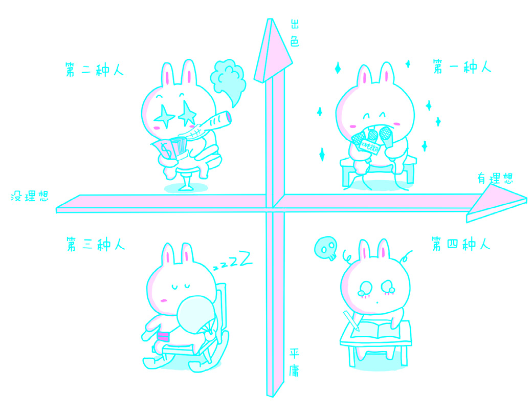 而如果某个人是第二种人,那他可就倒霉了。因为,第四种人会误以为他是第一种人,亦由此把他当作自己的敌人或者竞争对手。第四种人是不会相信有人真的没有“理想”或者“野心”的。于是,这第二种人就不得不证明自己,生活也因此平添不知道多少烦恼。这只是一个初步分析,往下还有更复杂的。