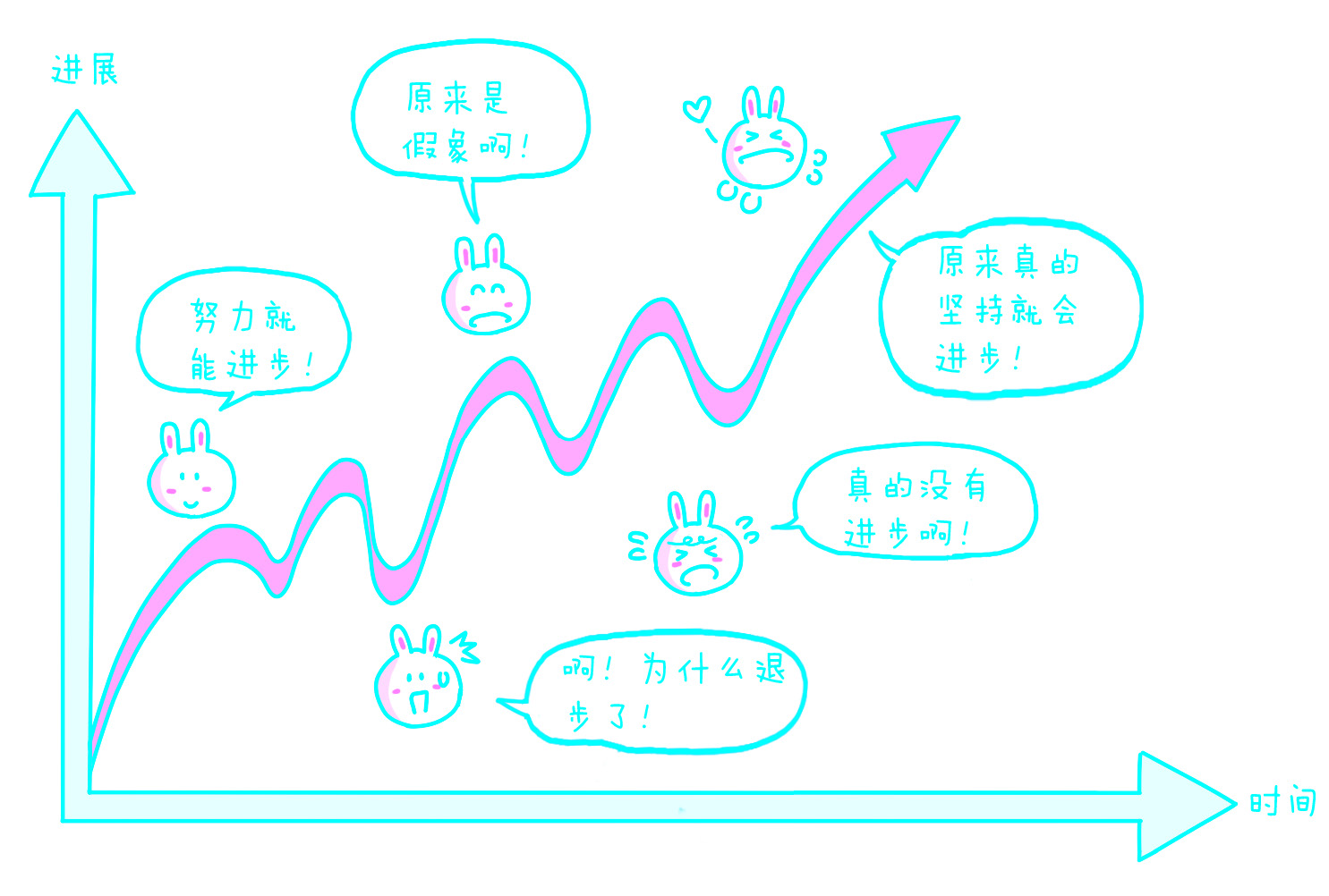 说到这里,我们可以看到,若把学习中时间和进展的关系理解为纯粹的线性关系,那我们最终根本不可能收获满意的进展。其实,没有哪个人可以长时间忍受失望。这样看来,曾经的放弃,往往不是因为没有毅力,只是因为对时间和进展的关系理解错误——在频繁失望甚至绝望的情况下居然坚持了那么久,我们原来是这么地有毅力啊!