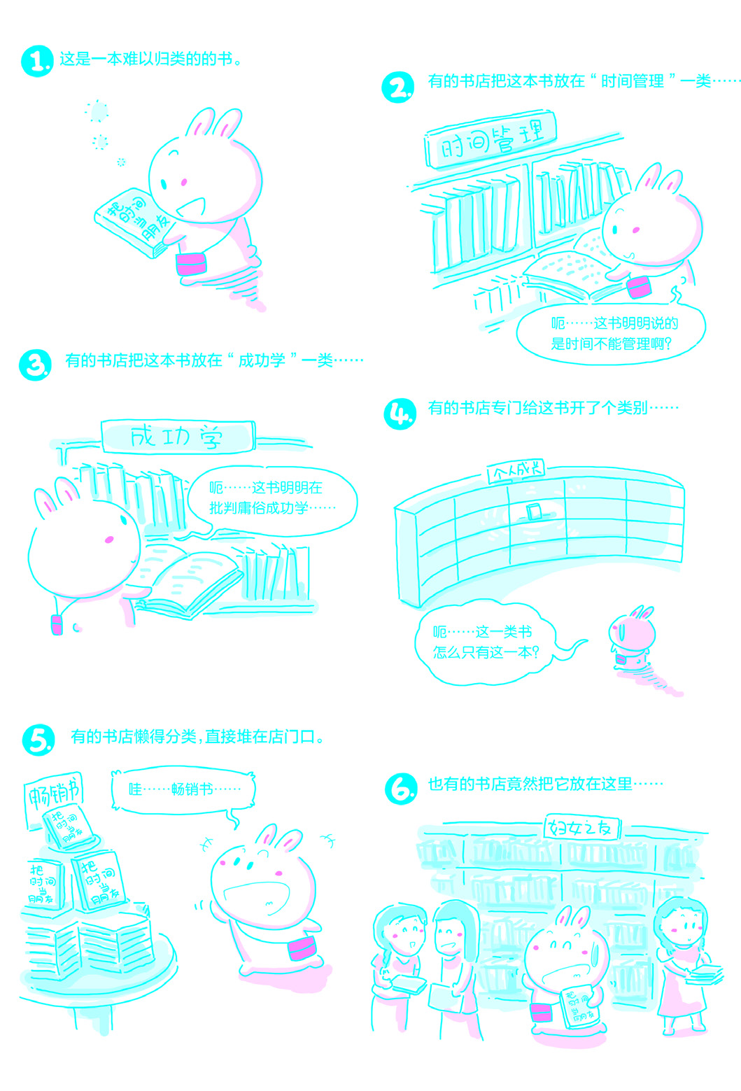 本书主张“时间不可管理”,这使书店在销售它的时候颇为尴尬。想想看,这本书放在哪个类别里好呢?放在“时间管理”类别里,显然不合适——因为本书的主旨明明是“时间不可管理”。放在“成功励志”里呢?也不合适,因为本书中有整整一章专门批评庸俗成功学。有的网上书店为这本书专门开辟了一个类别——个人成长,这个类别里只有一本书——《把时间当作朋友》。有的书店懒得操心,随便把这本书放在一个地方——有读者来信告诉我说他在“妇女之友”类别里看到了这本书。当然,更多的书店想出了一个很好的方法——不分类了——反正畅销,直接堆在店门口……